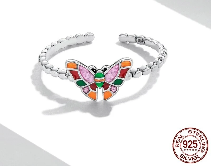 Bague ouverte en argent 925 sterlings avec la représentation d’un joli papillon harmonie de couleur.