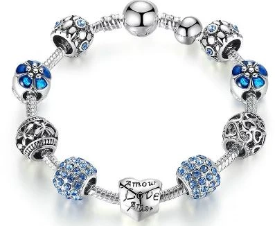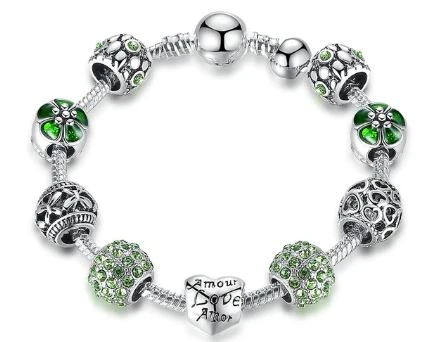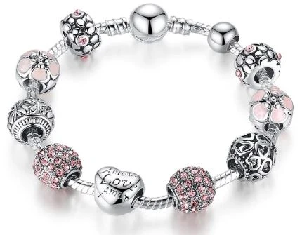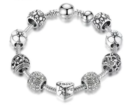Très jolie bracelet harmonie à breloques plaqué en argent avec des petites perles d’amour et de fleurs.