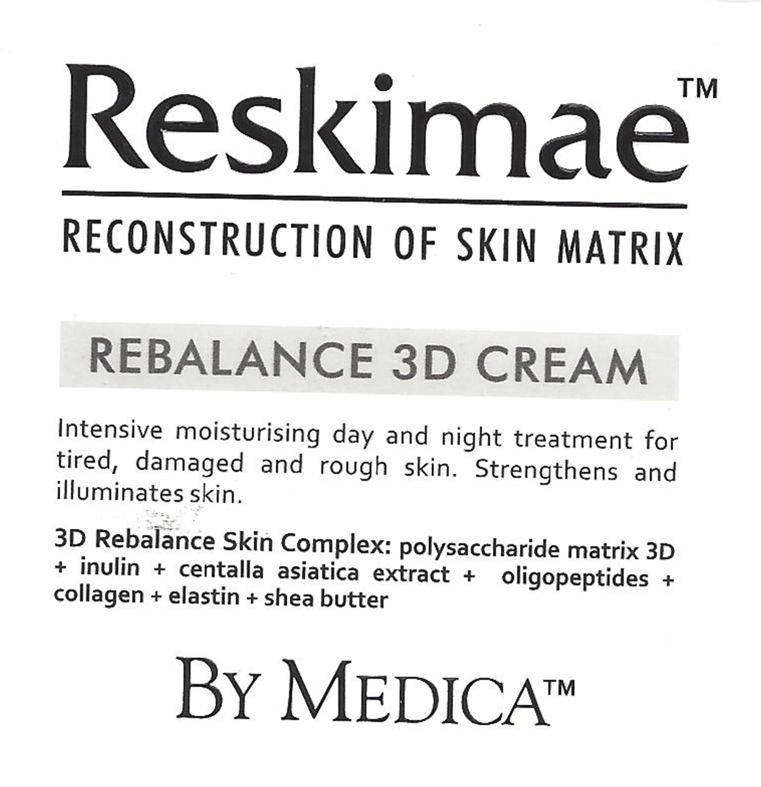 La Crème de soin jour et nuit – 50ml et un traitement hydratant intensif jour et nuit pour la peau fatiguée, abimée et rugueuse. Renforce et illumine la peau. Contient un complexe 3D Rebalance Skin. (Polysacchaides de la matrice 3D + inuline + extrait de Centella asiatica + oligopeptides + collagène + élastiene + beurre shea.