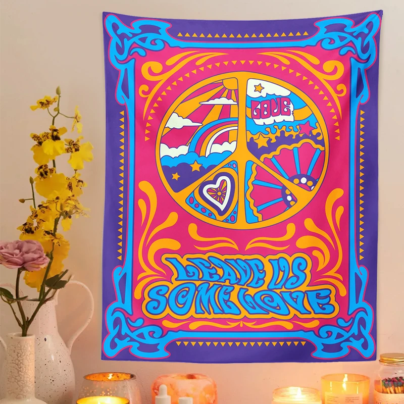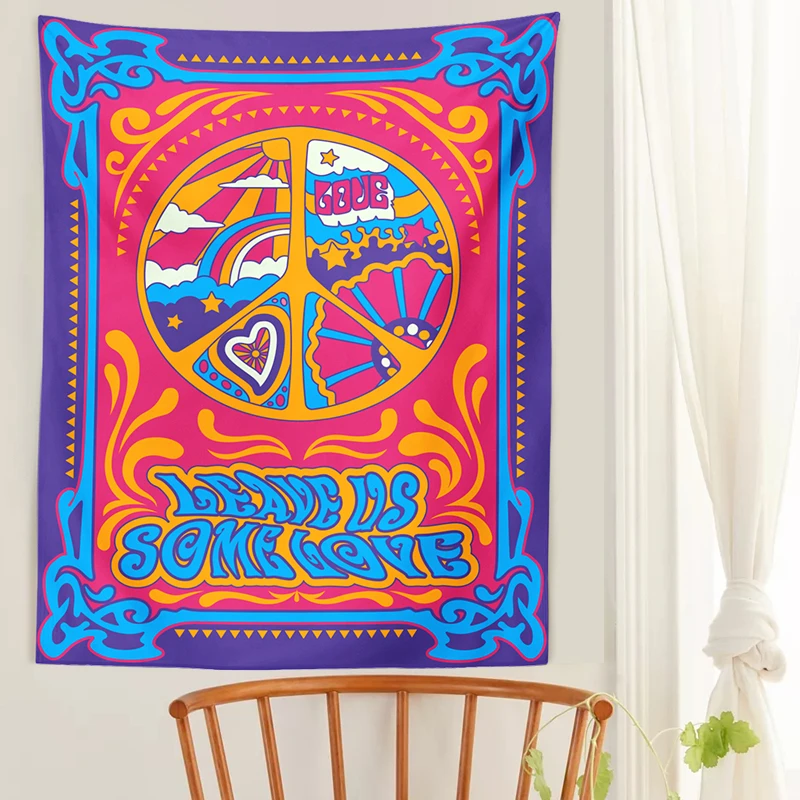 Il s’agit d’une toile assez fine en polyester imprimé en couleur sur la décoration Peace Love look 1970s.